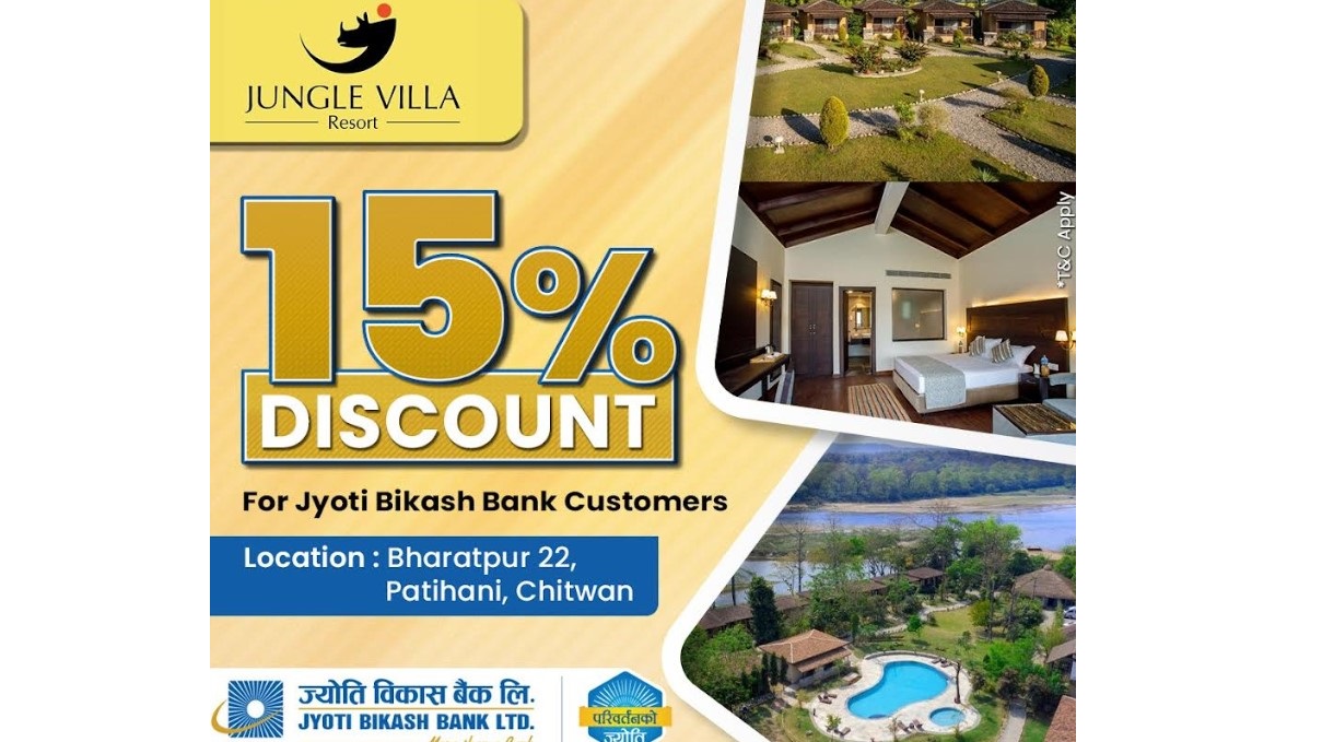 काठमाडौं – ज्योति विकास बैंकका ग्राहकहरुलाई चितवनको कसरास्थित जंगल भिल्ला रिसोर्टमा छुट दिइने भएको छ । दुई पक्षबीच भएको सम्झौता अनुसार रिसोर्टमा पाइने फुड एन्ड वेबरेजसहित रुम चार्जमा ज्योति विकास बैंकका ग्राहकलाई १५ प्रतिशतसम्म छुट हुनेछ । ज्योति विकास बैंकले यसअघि कमलपोखरीस्थित प्रख्यात अचार घर, दरबारमार्गको महोत्सब रेष्टुरेन्ट एन्ड बार, हात्तीसारको नेपाल हाउस रेष्टुरेन्ट एन्ड…