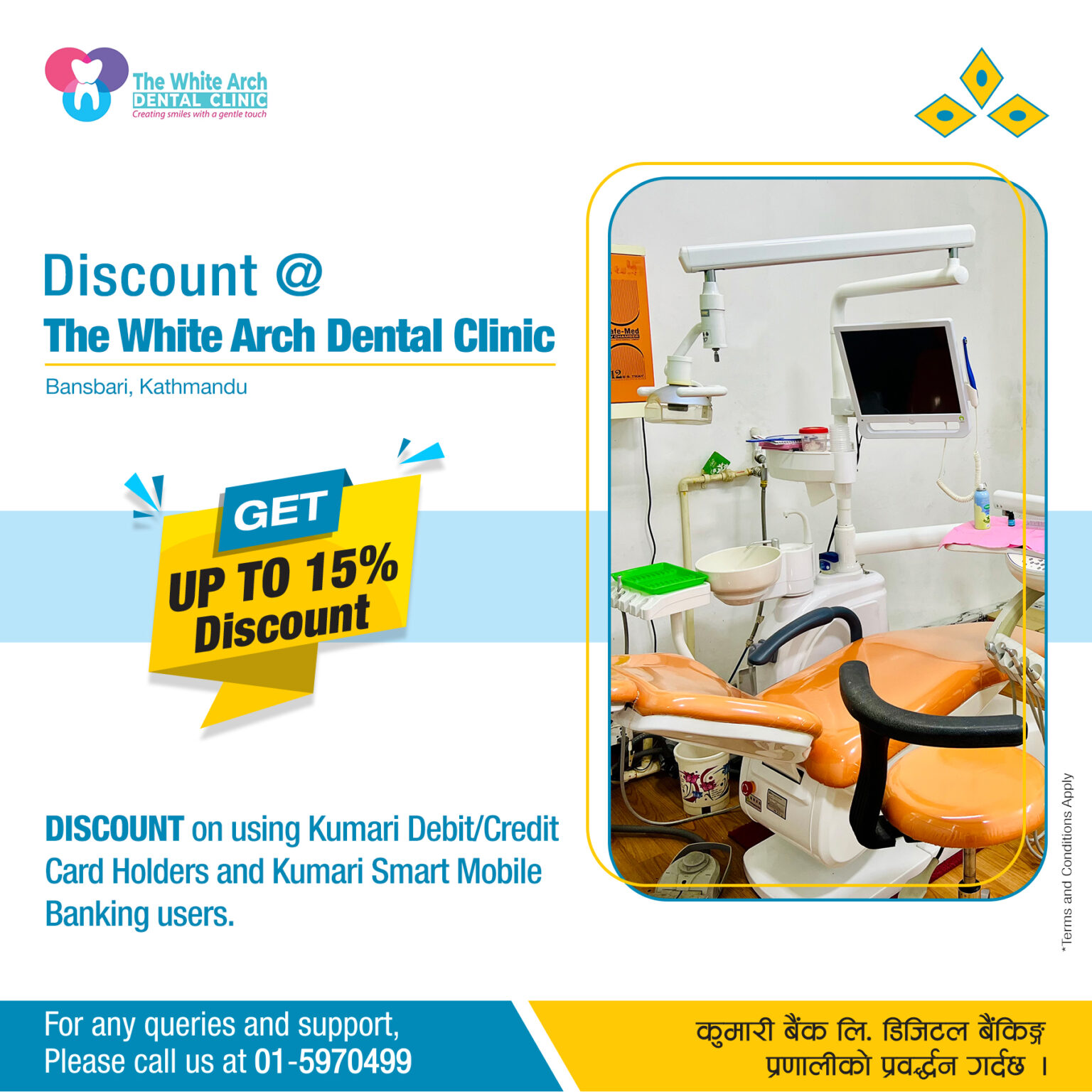काठमाडौं – कुमारी बैंक लिमिटेड र बाँसबारी, काठमाडौं स्थित दि ह्वाइट आर्क डेन्टल क्लिनिक बीच कुमारी बैंक लिमिटेडका ग्राहक महानुभावहरुलाई हस्पिटलबाट प्रदान गरिने सेवाहरुमा विशेष छुट प्रदान गर्ने सम्झौता भएको छ । यस सम्झौता अनुसार कुमारी बैंक लिमिटेडका ग्राहक महानुभावहरुले सो क्लिनिकबाट सम्पूर्ण सेवाहरु लिए बापत कुमारी बैंकको डेबिट/क्रेडिट कार्ड अथवा क्युआर बाट भुक्तानी गर्दा…