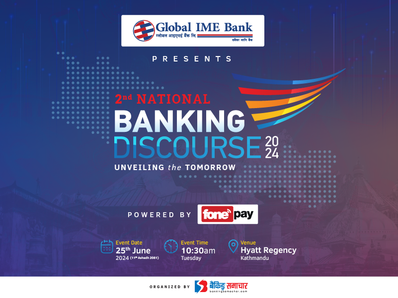 काठमाडौं – बैंकिङ्ग समाचार डटकमको आयोजना तथा ग्लोबल आईएमई बैंकको मुख्य प्रायोजन तथा फोन पेको सहप्रायोजनमा असार ११ गते दोस्रो ‘नेशनल बैंकिङ्ग डिस्कोर्स २०२४’ आयोजना हुने भएको छ। काठमाडौंको हायत रिजेन्सीमा आयोजना हुने उक्त कार्यक्रमको उद्घाटन नेपाल राष्ट्र बैंकका गभर्नर महाप्रसाद अधिकारीद्वारा गरिनेछ। साथै, कार्यक्रमकाे विशेष सत्रमा छलफलका लागी अर्थमन्त्री वर्षमान पुनको उपस्थिति रहने उक्त…