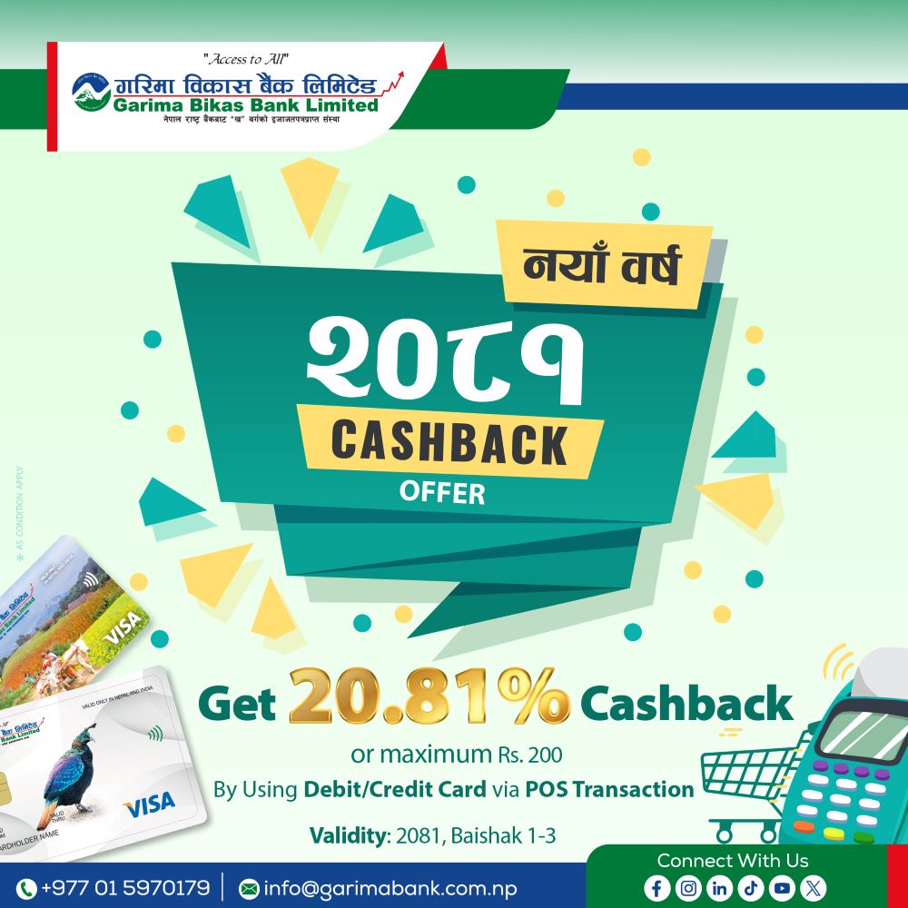 काठमाडौं– गरिमा विकास बैंकले डेबिट/क्रेडिट कार्डमा २०.८१ प्रतिशत क्यास ब्याक लिने योजना सार्वजनिक गरेको छ । बैंकले आउँदै गरेको नेपाली नयाँ वर्ष २०८१ लाई लक्षित गरी आफ्ना ग्राहकहरुका लागि कुनै पनि सेवा तथा सामान खरिद गरी विकास बैंकको डेबिट/क्रेडिट कार्डबाट भुक्तानी गर्दा २०.८१ प्रतिशत वा अधिकतम रु. दुई सय नगद फिर्ता पाउन सक्ने योजना सार्वजनिक…