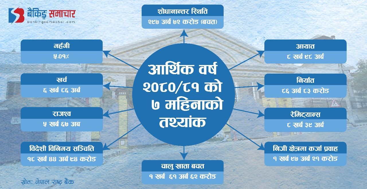 काठमाडौं– केन्द्रीय बैंकले आइतबार सार्वजनिक गरेको चालु आर्थिक वर्षको सात महिनाको तथ्याङ्कमा आधारित ‘मुलुकको वर्तमान आर्थिक तथा वित्तीय स्थिति’ प्रतिवेदनअनुसार अर्थतन्त्रका अधिकांश सूचक सकारात्मक देखिएका छन् । नेपाल राष्ट्र बैंकका अनुसार फागुन मसान्तसम्ममा वार्षिक विन्दुगत आधारमा उपभोक्ता मूल्य सूचकाङ्कमा आधारित मुद्रास्फीति ५.०१ प्रतिशत रहेको छ । सरकारले चालु आवका लागि मुद्रास्फीति ६.५ प्रतिशतको वाञ्छित सीमाभित्र…