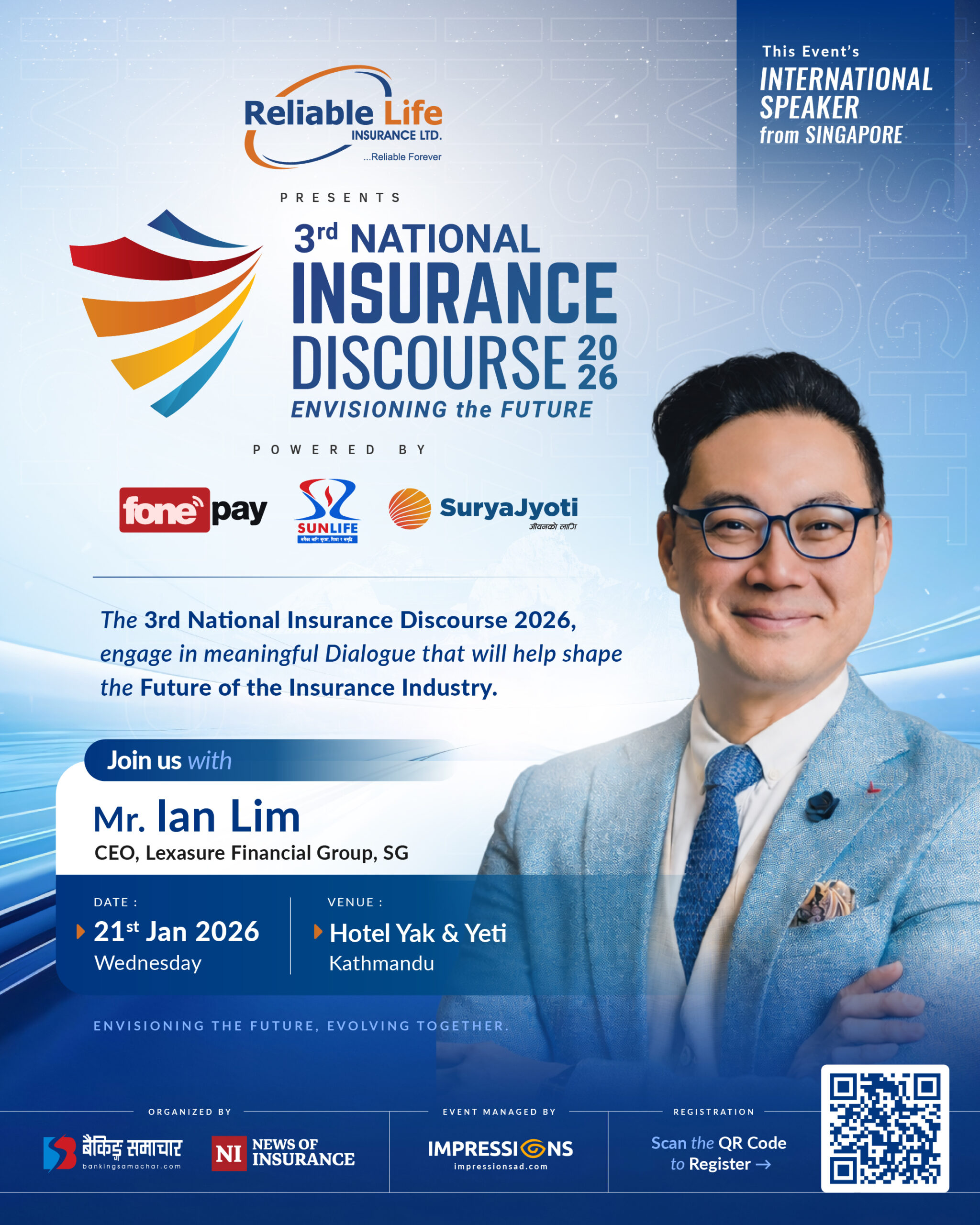 काठमाडौं – तेस्रो इन्स्योरेन्स डिस्कोर्श २०२६ को तेस्राे सत्रमा वक्ताका रुपमा सिंगापुरको लेक्सास्योर फाइनान्सियल ग्रुपका प्रमुख कार्यकारी अधिकृत (सीईओ) इयान लिम सहभागी हुने भएका छन्। बैंकिङ्ग समाचार र न्युज अफ इन्स्योरेन्सको संयुक्त आयोजनामा हुन लागेको तेस्रो इन्स्योरेन्स डिस्कोर्शको‘ स्वास्थ्य सेवाको पहुँच, नेपालमा स्वास्थ्य बीमाको भविष्य’ विषयक सत्रमा लिम सहभागी हुने भएका हुन्। बीमा तथा वित्तीय…