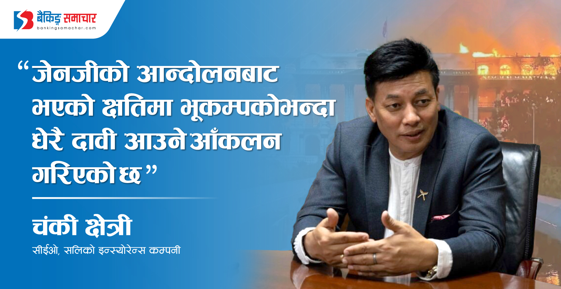 काठमाडौ – भदौ २४ गते देशभर उग्र बनेको जेनजी आन्दोलनले अर्बौं सम्पत्तिको क्षति भएको छ । जसकारण बीमा कम्पनीहरूमा भूकम्पको समयमा परेको १७ अर्ब दाबी भन्दा धेरै क्षतिको आँकलन गरिएको सलिको इन्स्योरेन्स कम्पनीको प्रमुख कार्यकारी अधिकृत सीईओ चंकी क्षेत्रीले बताएका छन् । तर, सरकारी सम्पत्तिको बीमाको कुरा सधैँ उठान भएतापनि सरकारले सधैँ बेवास्ता गरेको थियो…