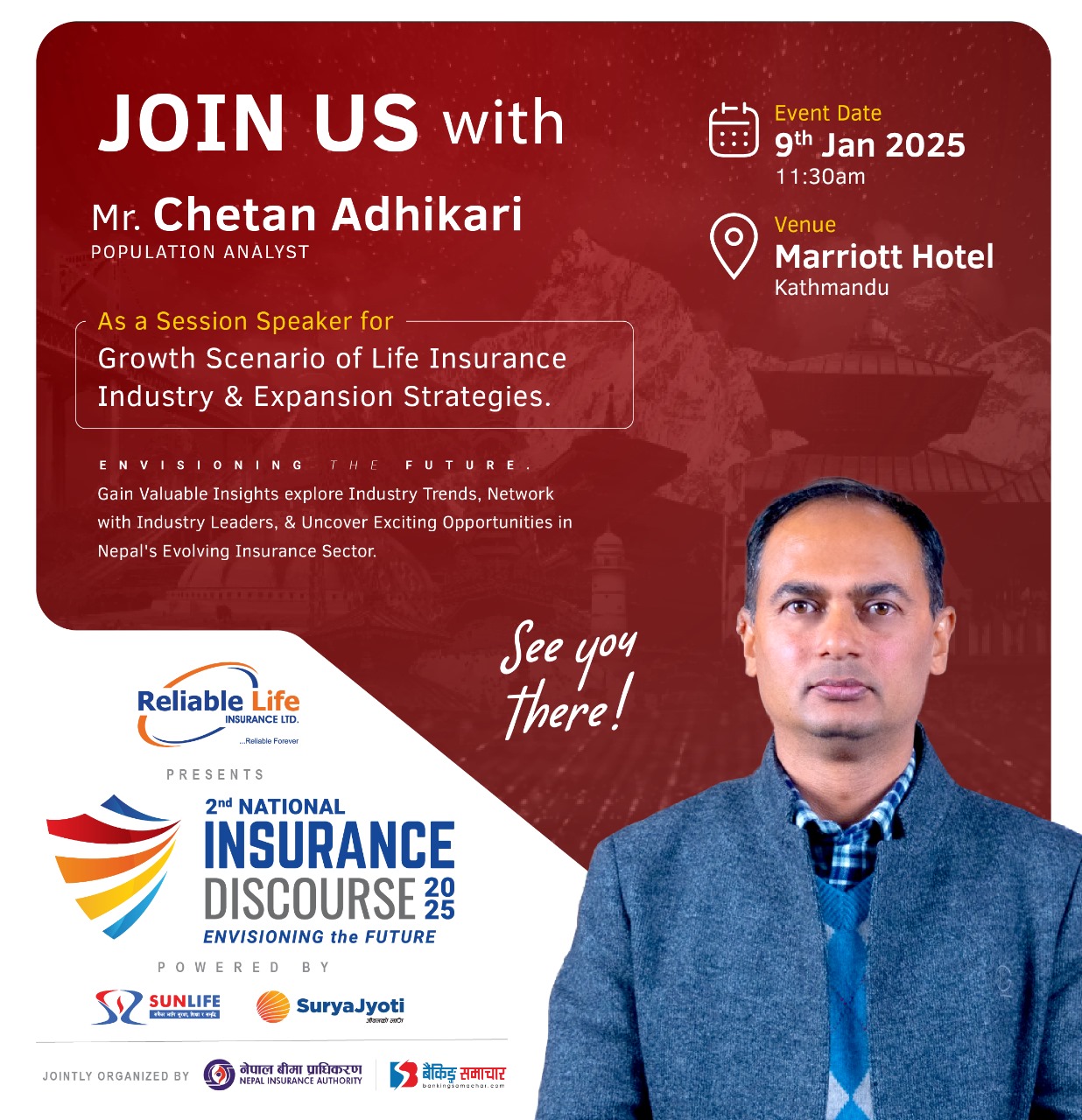 काठमाडौं – दोस्रो नेशनल इन्स्योरेन्स डिस्कोर्श २०२५ को विभिन्न सत्र मध्ये पहिलो सत्रमा वक्ताको रुपमा जनसंख्या विद् चेतन अधिकारी सहभागी हुने भएका छन् । छलफलको पहिलो सत्र जीवन बीमा क्षेत्रको विकास र विस्तारका रणनीति तथा परिदृश्य शिर्षकमा हुने छलफलमा वक्ताको रुपमा सहभागी हुने भएका हुन् । चेतन अधिकारी,पत्रकारिता र अनुसन्धानमा संलग्न छन् । उनले जनसंख्या…