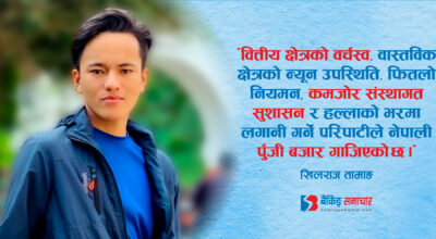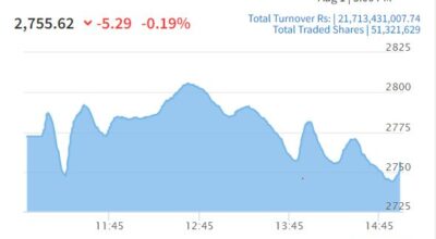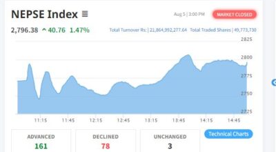 काठमाडौं – आज बुधबार नेपाल स्टक एक्सचेञ्ज (नेप्से)मा १०८.३५ अंकले बढेको छ । कारोबार सुरु भएदेखि नै बढ्न सुरु गरेको शेयर बजार अन्तिमसम्ममा ४.०८ प्रतिशतले बढेको हो । हिजो मंगलबार १४५ अंकले बजार घटेको थियो । ५.१८ प्रतिशतले घट्दै हिजो परिसूचक २६ सय ५१ अंकमा आएर रोकिएको थियो । तर आज फराकिलो अंकले बढ्दै परिसूचक…