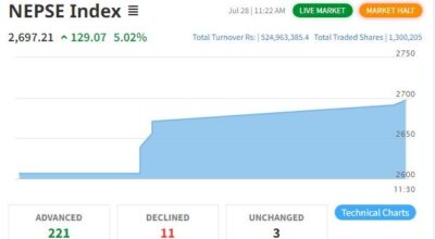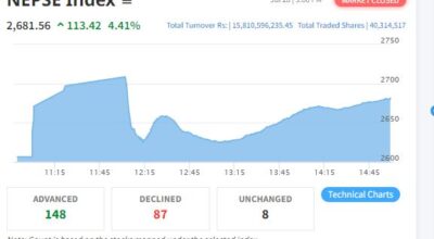 काठमाडौं – साताको पहिलो कारोबारको दिन आइतबार शेयर बजारमा दुई पटक सकारात्मक ‘सर्किट ब्रेक’ लागेकाे छ। आइतबार बजार खुलेको १ मिनेटमै नेप्से परिसूचक ४ प्रतिशतले बढेपछि पहिलो सर्किट ब्रेक लाग्यो। २० मिनेटपछि खुलेको बजारमा पुनः १ मिनेटमै थप १ प्रतिशत विन्दु अर्थात् ५ प्रतिशतले बढेपछि दोस्रो सर्किट ब्रेक लागेको थियो। दोस्रो पटकको सर्किट ब्रेकपछि भने…