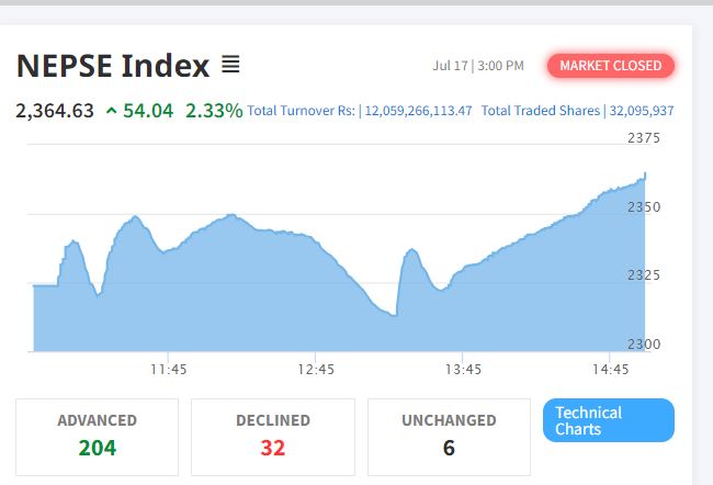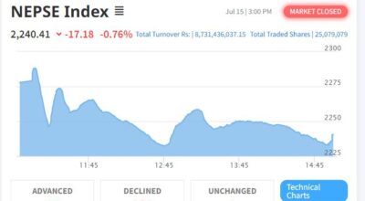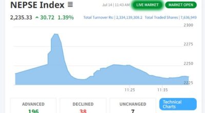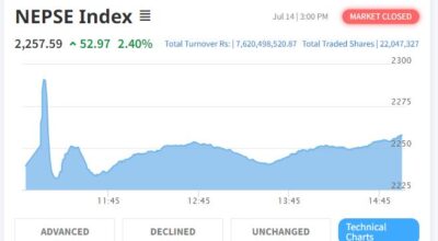 काठमाडौं – साताको चौथो कारोबारको दिन बुधबार शेयर बजार दोहोरो अंकले बढेको छ। आज शेयर बजार नेप्से परिसूचक ५४ दशमलव ०४ अंकले बढेर २,३६४ दशलमव ६३ को विन्दुमा कायम भएको छ। आज २०४ कम्पनीको शेयर मूल्य बढेको छ भने ३२ कम्पनीको शेयर मूल्य घटेको छ। आज ३०६ कम्पनीको ३ करोड २० लाख ९५ हजार ९३७…