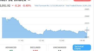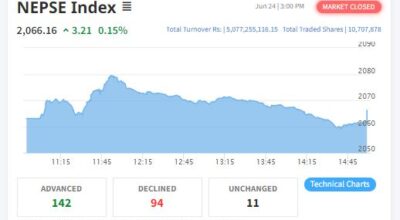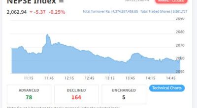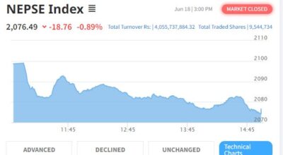काठमाडौं–आज साताको पहिलो दिन शेयर बजार घटेर बन्द भएको छ । आज शेयर बजार नेप्से परिसूचक १४ दशलमव ८३ अंकले घटेर २,०३७ को विन्दुमा कायम भएको छ । आज ४९ कम्पनीको शेयर मूल्य बढेको छ भने १९० कम्पनीको शेयर मूल्य घटेको छ । आज दिनभरिमा ३२० कम्पनीको ९१ लाख ७८ हजार ८९५ कित्ता शेयर किनबेच…
