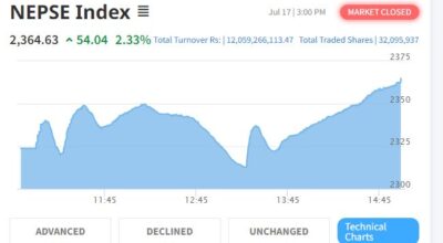 काठमाडौं – केही दिन यता निरन्तर बढिरहेको शेयर बजार आज (बुधबार) भने घटेर बन्द भएको छ। आज शेयर बजार नेप्से परिसूचक २९ दशमव ३२ अंकले घटेर २,५३६ को विन्दुमा कायम भएको छ । आज ४६ कम्पनीको मात्रै शेयर मूल्य बढेको छ भने १९४ कम्पनीको शेयर मूय घटेको छ । आज ३११ कम्पनीको ४ करोड ७…