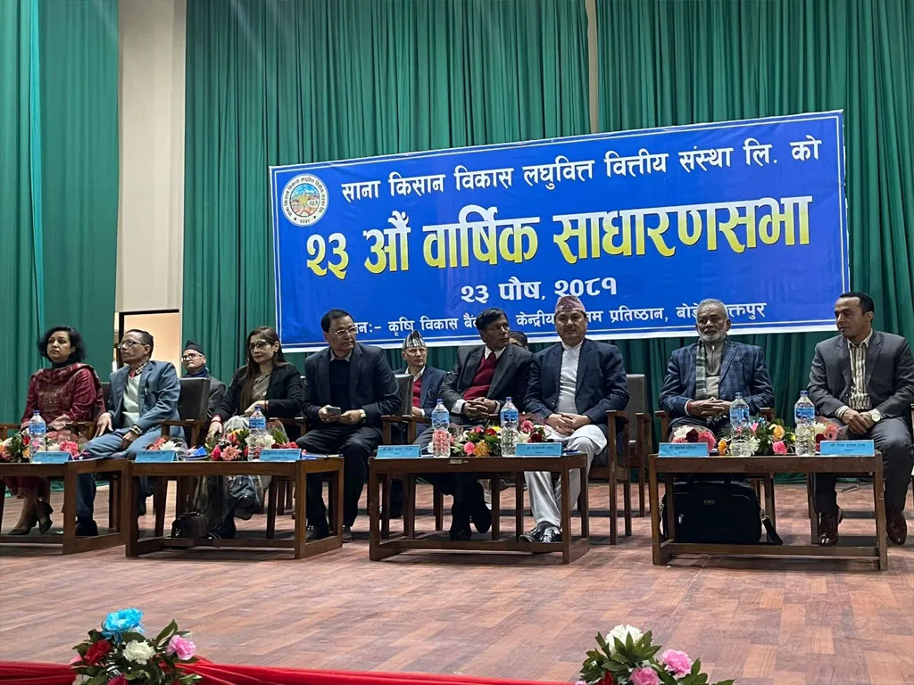 काठमाडौं- साना किसान विकास लघुवित्त वित्तीय संस्थाको मंगलबार साँझ सम्पन्न २३औँ वार्षिक साधारण सभाले १४ प्रतिशत बोनस शेयर पारित गरेको छ । सञ्चालक समितिको तर्फबाट अध्यक्ष खेमबहादुर पाठकले प्रस्ताव गरेको १३ दशमलव तीन प्रतिशत बोनस र कर प्रयोजनका लागि नगद लाभांश शून्य दशमलव सात प्रतिशत गरी १४ प्रतिशत बोनस शेयर प्रदान गर्ने प्रस्ताव साधारण सभाले…