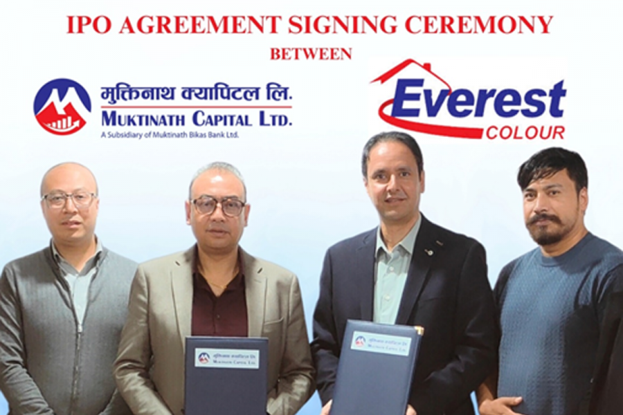 काठमाडौं – एभरेष्ट कलर लिमिटेडले सर्वसाधारणमा साधारण शेयर (आईपीओ) जारी गर्ने तयारी गरेको छ । कम्पनीले आईपीओ निष्काशनको प्रक्रिया अघि बढाउनका लागि बिक्री प्रबन्धकमा मुक्तिनाथ क्यापिटललाई नियुक्त गरेकाे छ । एक कार्यक्रमकाबिच एभरेष्ट कलरका तर्फबाट प्रबन्ध सञ्चालक सरोज लुईटेल र मुक्तिनाथ क्यापिटलको तर्फबाट प्रमुख कार्यकारी अधिकृत कबिन्द्र ध्वज जोशीले सम्झौता पत्रमा हस्ताक्षर गरेका छन् ।…