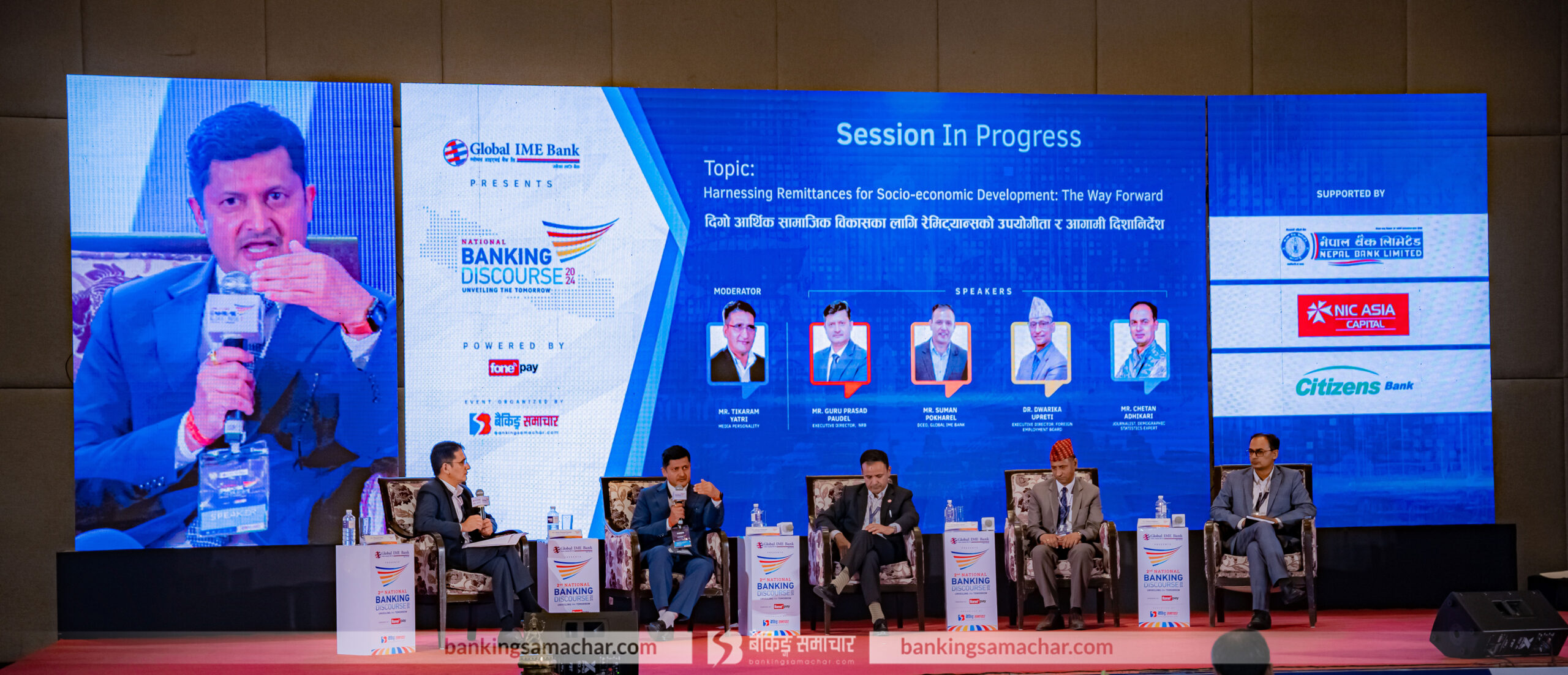 काठमाडाैं – नेपाल राष्ट्र बैंकका बैंक तथा वित्तीय संस्था नियमन विभागका कार्यकारी निर्देशक गुरु प्रसाद पौडेलले रेमिन्ट्यासबाट जीविकाेपार्जन हुनुलाई उत्पादनमुखी मान्न सकिने बताएका छन् । ‘दोस्रो नेशनल बैंकिङ्ग डिस्कोर्स २०२४’ डिस्कोर्सको तेस्रो सत्र ‘सामाजिक आर्थिक विकासका लागि रेमिट्यान्सको दिगो उपयोगिता र आगामी दिशानिर्देश’ मा कार्यकारी निर्देशक पाैडेलले नेपालमा भित्रिएका ७२ देखि ७४ प्रतिशत रेमिट्यान्स जीविकाेपार्जनमा…