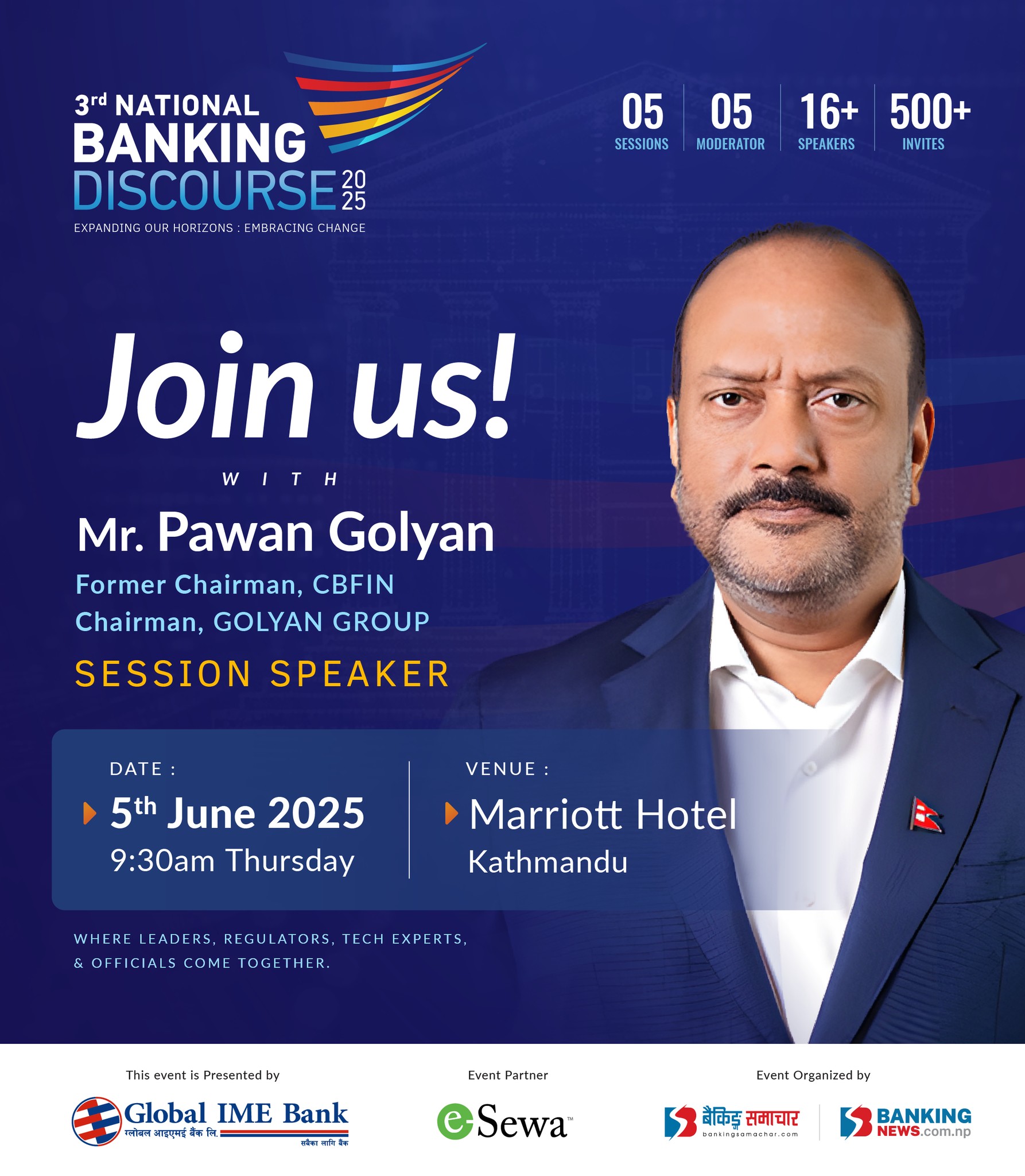 काठमाडौं – तेस्रो बैंकिङ्ग डिस्कोर्श २०२५ को चौथो सत्रको वक्ताका रुपमा बैंक तथा वित्तीय संस्था परिसंघका पुर्व अध्यक्ष तथा गोल्यान ग्रुपका अध्यक्ष पवन गोल्यान सहभागी हुने भएका छन् । बैंकिङ्ग समाचार डटकमको आयोजनामा आगामी जेठ २२ गते हुने तेस्रो बैंकिङ्ग डिस्कोर्शको चौथो सत्र ‘मौद्रिक नीतिः आर्थिक शिथिलताको चक्र तोड्न वित्त नीति र मौद्रिक नीतिको रणनीतिक…
