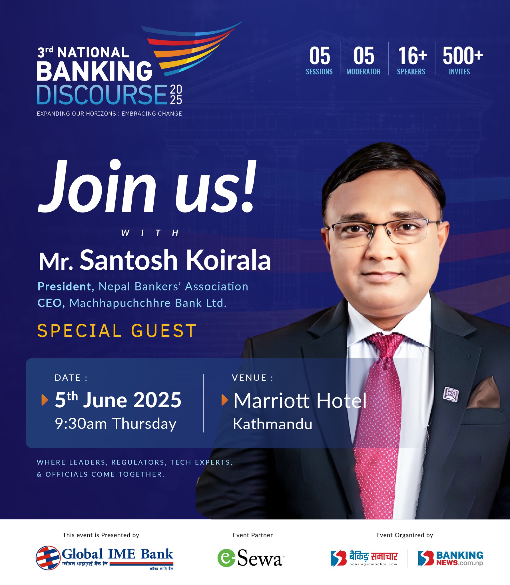 काठमाडौं – तेस्रो बैंकिङ्ग डिस्कोर्श २०२५ को उद्घाटन सत्रमा नेपाल बैंकर्स संघका अध्यक्ष सन्तोष कोइराला सहभागी हुने भएका छन् । बैंकिङ्ग समाचार डटकमको आयोजनामा आगामी जेठ २२ गते हुने तेस्रो बैंकिङ्ग डिस्कोर्शमा अध्यक्ष कोइराला सहभागी हुने भएका हुन् । भोजपुरको भोजपुर नगरपालिकामा जन्मे हुर्केका कोइरालाले झापाको चन्द्रगढी–६ स्थित वीरेन्द्र माविबाट २०४५ सालमा एसएलसी उत्तीर्ण गरेका…