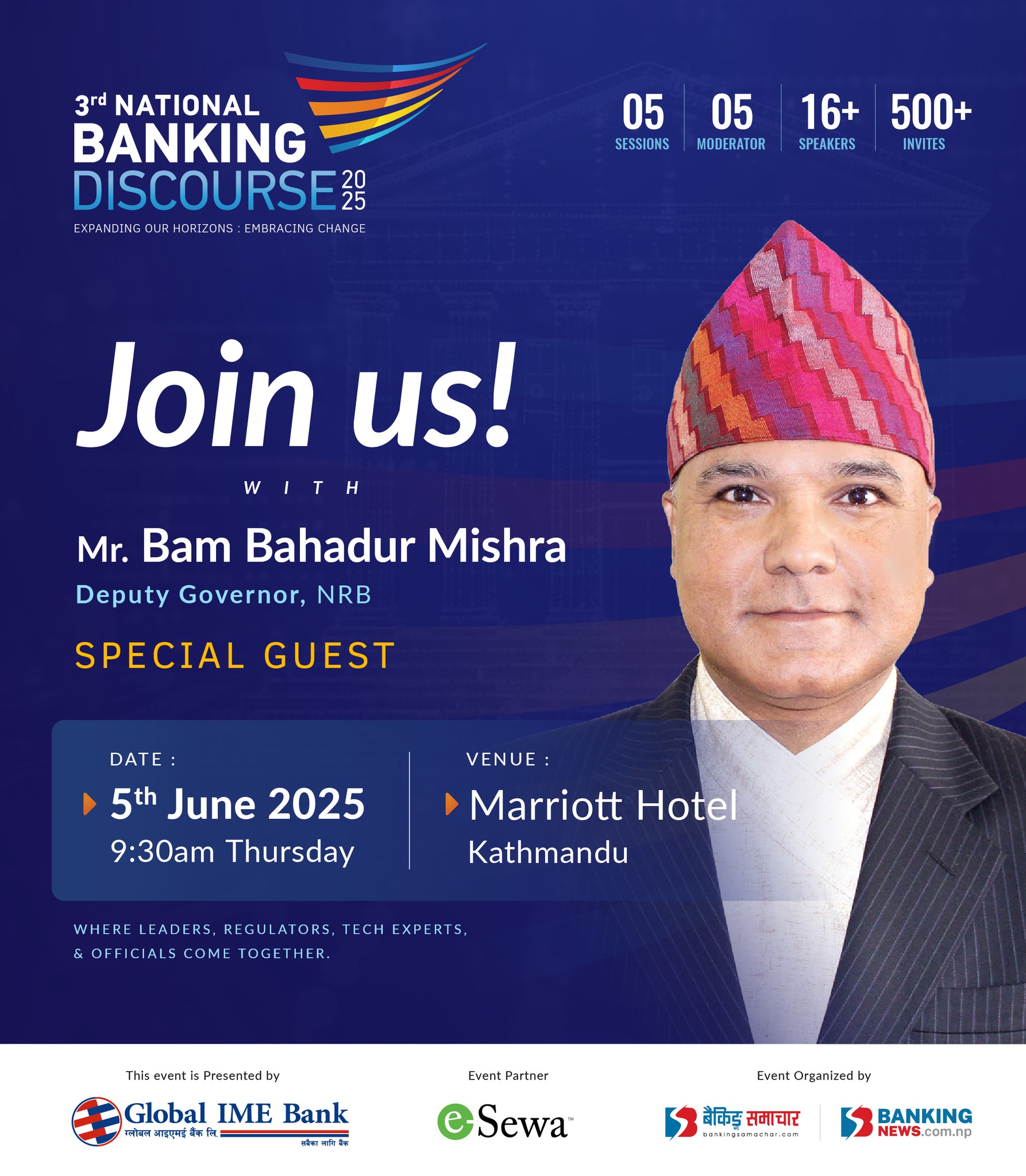 काठमाडौं – तेस्रो बैंकिङ्ग डिस्कोर्श २०२५ को विशेष सत्रमा नेपाल राष्ट्र बैंकका डेपुटी गभर्नर बम बहादुर मिश्र सहभागी हुने भएका छन् । बैंकिङ्ग समाचार डटकमको आयोजनामा आगामी जेठ २२ गते हुने तेस्रो बैंकिङ्ग डिस्कोर्शकाे विशेष सत्रमा मिश्र सहभागी हुने भएका हुन् । पाँचथर जन्मथलो भएका मिश्रले अमृत साइन्स क्याम्पसबाट फिजिक्स पढेका छन् । मिश्रले केही…