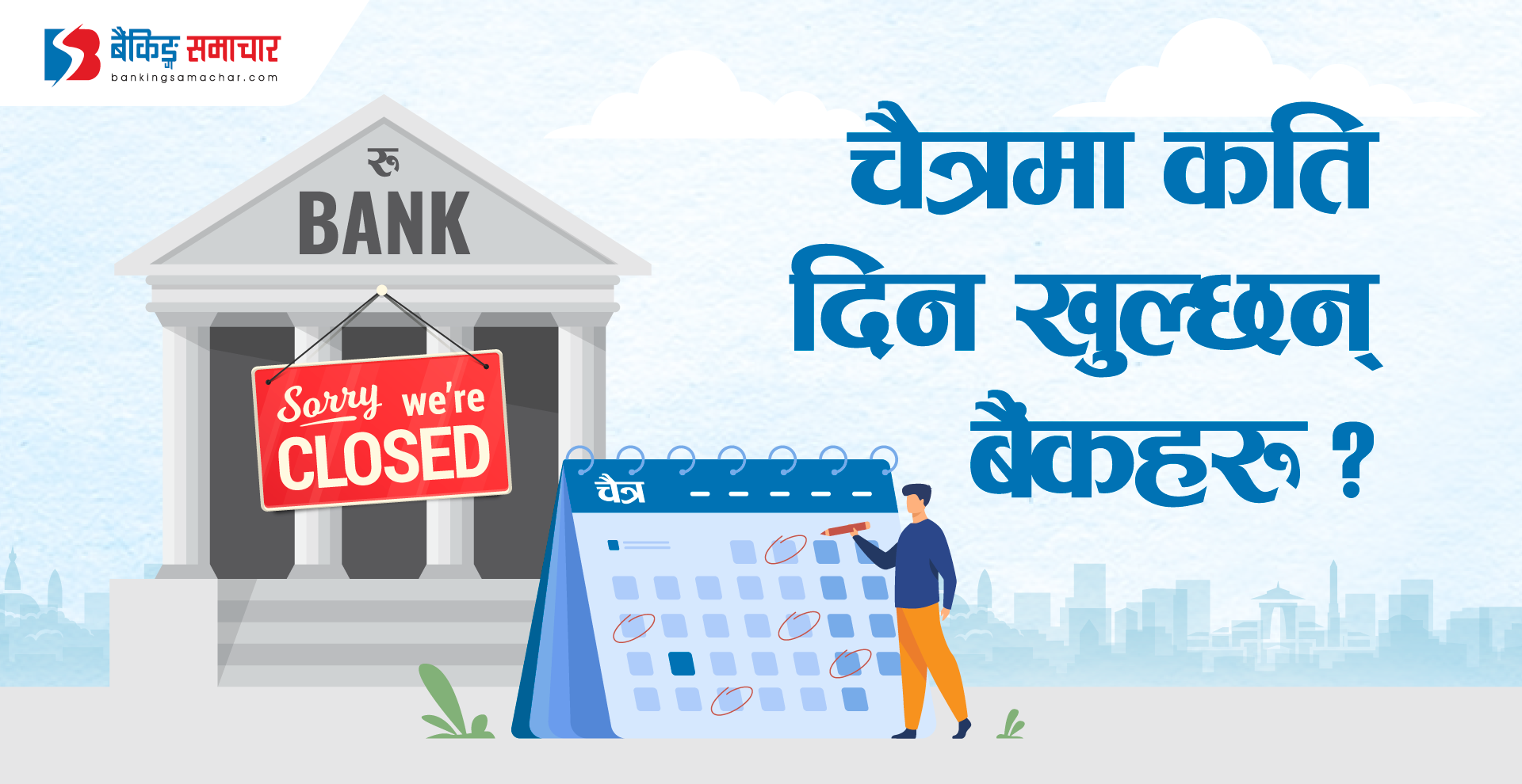 काठमाडौं – चैत महिनामा ५ दिन बैंक तथा वित्तीय संस्थाहरू बन्द रहने भएका छन् । अन्य सार्वजनिक बिदा र शनिबारसहित आजबाट सुरु भएको चैतमा बैंकहरुले २६ दिन सेवा दिने भएका हुन् । चैत १ गते अर्थात् आज फागु पूर्णिमा (होली) का कारण तराई जिल्लामा सार्वजनिक बिदा छन् । जसले गर्दा त्यस क्षेत्रमा रहेका बैंक तथा…