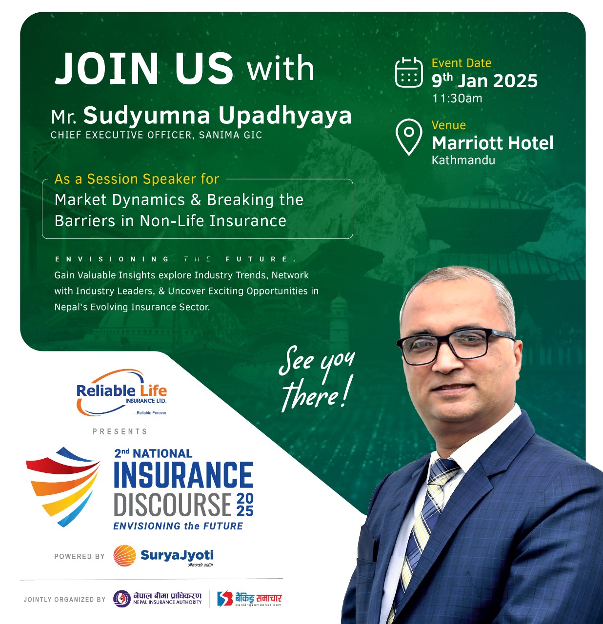 काठमाडौं– दोस्रो नेशनल इन्स्योरेन्स डिस्कोर्श २०२५ मा वक्ताका रुपमा सानिमा जिआईसी इन्स्योरेन्सको प्रमुख कार्यकारी अधिकृत (सीईओ) सुधुम्न उपाध्याय सहभागी हुने भएका छन् । छलफलको दोस्रो सत्र ‘निर्जीवन बीमा क्षेत्रमा बजारको गतिशीलता र अवरोध’ शिर्षकमा हुने छलफलमा वक्ताका रुपमा उपाध्याय सहभागी हुने भएका हुन् । उपाध्यायसँग बीमा क्षेत्रमा दुई दशकभन्दा बढीको व्यावसायिक अनुभव छ । उनले…