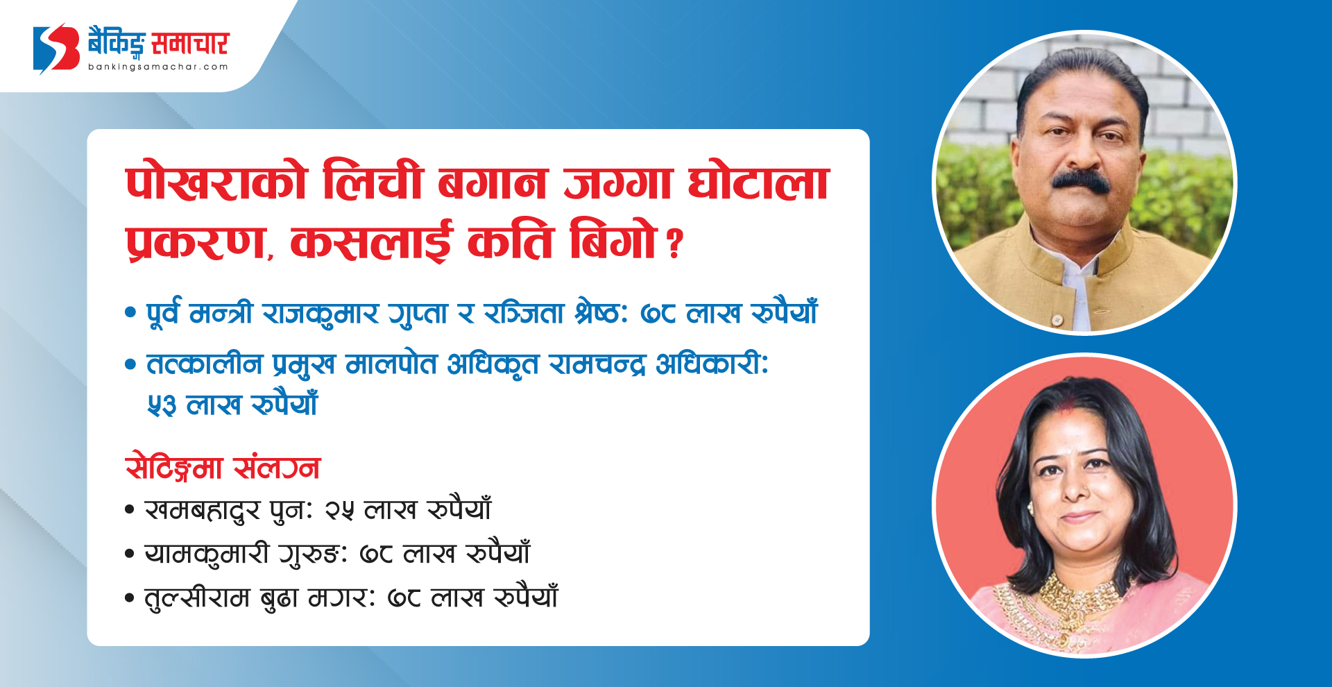 काठमाडौं – अख्तियार दुरुपयोग अनुसन्धान आयोगले पोखराको लिची बगानको जग्गा घोटाला प्रकरणमा दुई पूर्व मन्त्रीसहित ७ जनाविरुद्ध भ्रष्टाचार मुद्दा दायर गरेको छ। अख्तियारले एमाले नेता तथा पूर्वमन्त्री राजकुमार गुप्ता र नयाँ शक्ति पार्टी (नाउपा) की अध्यक्ष रञ्जिता श्रेष्ठसहित सात जनाविरुद्ध विशेष अदालतमा भ्रष्टाचार मुद्दा दायर गरेको हो। यो प्रकरण पोखराको लिची बगान क्षेत्रको सरकारी जग्गा…