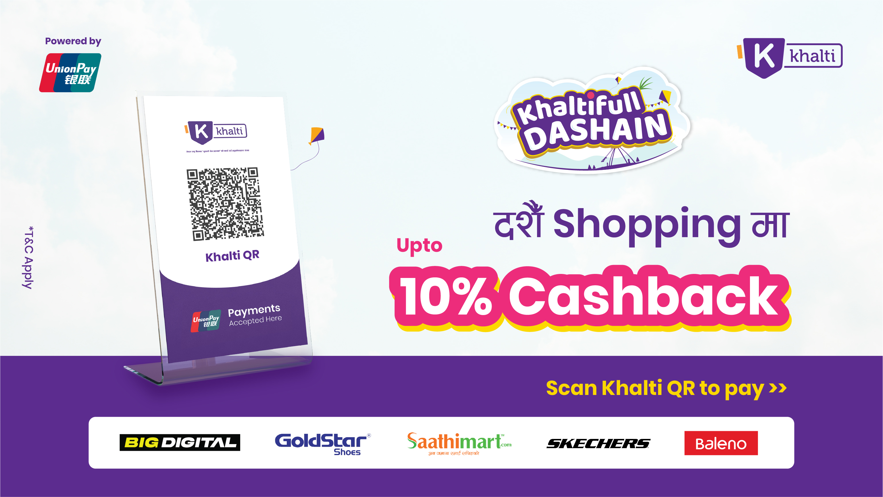 बैंकिङ्ग समाचार, काठमाडौं । नेपालीहरुको महान चाड बिजया दशमी, दिपावली तथा छठ पर्व को अवसरमा खल्तीले आफ्ना प्रयोगकर्ताहरूका लागि ‘खल्तीफुल दशैं’ अफर ल्याएको छ । यस अफर अन्तर्गत खल्ती प्रयोगकर्ताले यूनियन पे को क्यू आर तोकिएको आउटलेटमा खल्ती मार्फत स्क्यान गरि भुक्तानी गर्दा १०% (अधिकतम रू.५०० सम्मको) क्यासब्याक प्राप्त गर्न सक्नेछन् । प्रयोगकर्ताले निम्न उल्लेखित…