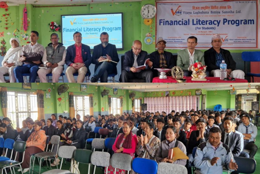 काठमाडौं – विजय लघुवित्त वित्तिय संस्थाको आयोजनामा बिद्यार्थीहरूका लागि वित्तीय साक्षरता कार्यक्रम सम्पन्न भएको छ । विजय सामुदायिक शिक्षा सदनको सभाहल गैडाकोटमा आयोजित कार्यक्रममा सो विद्यालयमा कक्षा ११ र १२ मा अध्ययनरत करिब २ सय जना विद्यार्थीहरुको सहभागिता रहेको थियो । विजय लघुवित्त वित्तिय संस्था लिमिटेडका सञ्चालक खेमराज सापकोटाको अध्यक्षतामा सम्पन्न सो कार्यक्रममा संस्थाका अध्यक्ष…